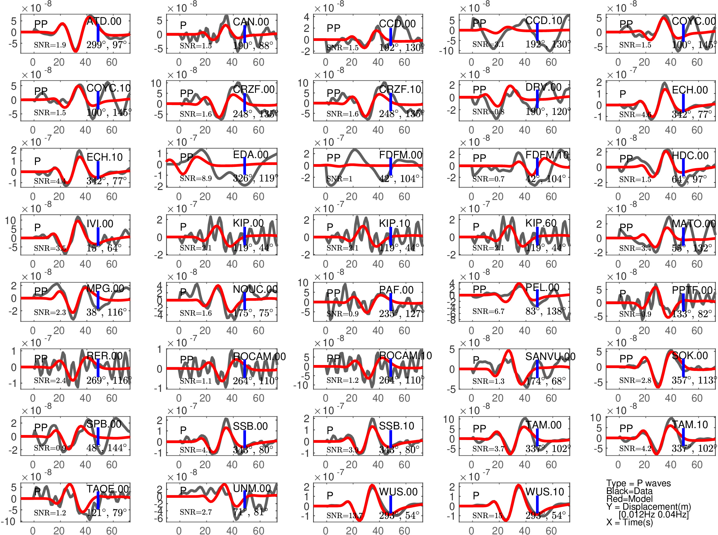 Figure 1: Agreement between data (black) and synthetics (red) for P or PP waves (the type of waves used is indicated in each subfigure). The comparison is shown with a time shift (noted 'Dt1' in Table 1), corresponding to the optimal fit ('Fit1' in Table 1) before the blue tick. Also indicated are the azimuth and distance of the station, and the signal to noise ratio (SNR). Note that the prediction done for PP waves is expected to be less accurate than the one for P waves.