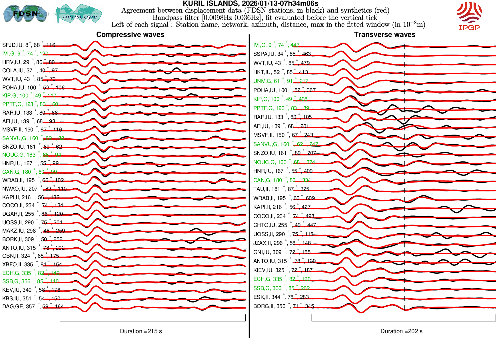 In the near-real time configuration presented here, the solution is typically posted 45 minutes after earthquake occurrence. Solution includes a map summing up the SCARDEC results and a figure showing the agreement to the data. The map presents the earthquake location (together with the plate boundaries from Bird [2003] and the slab contours of SLAB 1.0 [Hayes et al., 2012]) and the main SCARDEC source parameters. Numerical values of focal mechanism parameters and seismic moment are written below the map. The data agreement figure compares the SCARDEC synthetics (red) with the FDSN data (black), in the frequency range used for focal mechanism determination. The name of GEOSCOPE stations is written in green.