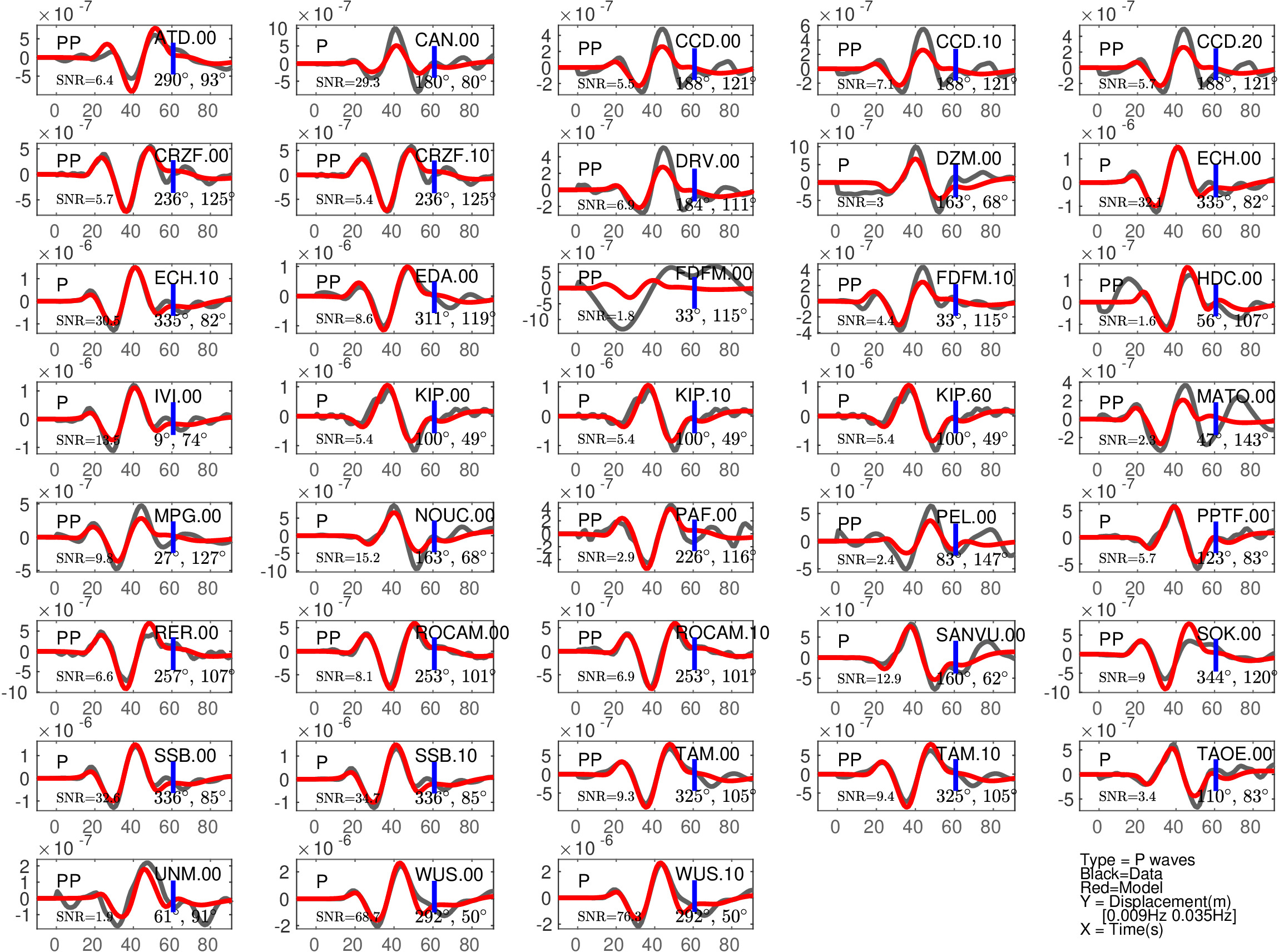 Figure 1: Agreement between data (black) and synthetics (red) for P or PP waves (the type of waves used is indicated in each subfigure). The comparison is shown with a time shift (noted 'Dt1' in Table 1), corresponding to the optimal fit ('Fit1' in Table 1) before the blue tick. Also indicated are the azimuth and distance of the station, and the signal to noise ratio (SNR). Note that the prediction done for PP waves is expected to be less accurate than the one for P waves.