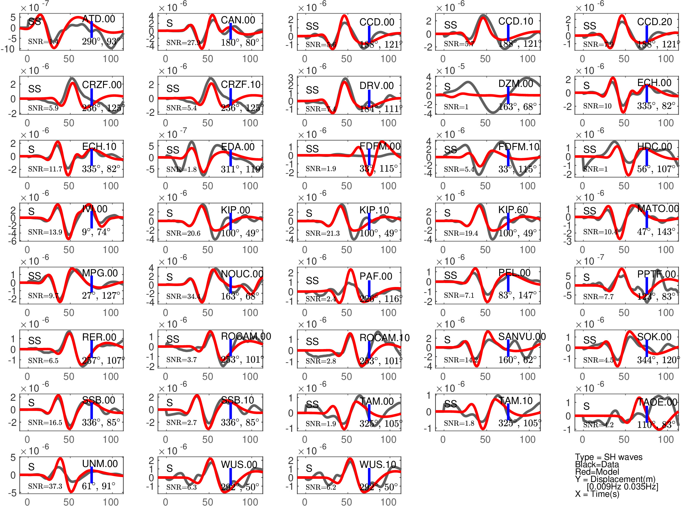 The SCARDEC solution is used here to predict the waveforms at all Geoscope stations received in real time and located at distances between 30° and 150° from the earthquake. All available location codes are used, for the BH* channels. In the range [30° - ~90°], the prediction is done on P and S(H) waves and in the range [~90° - 150°], it is done on PP and SS(H) waves. See agreement for P or PP waves (vertical components) between data and synthetics in Figure 1; see agreement for S(H) or SS(H) waves (horizontal components) between data (black) and synthetics (red) in Figure 2. Tables 1 and 2 provide quantitative estimates of these agreements.
