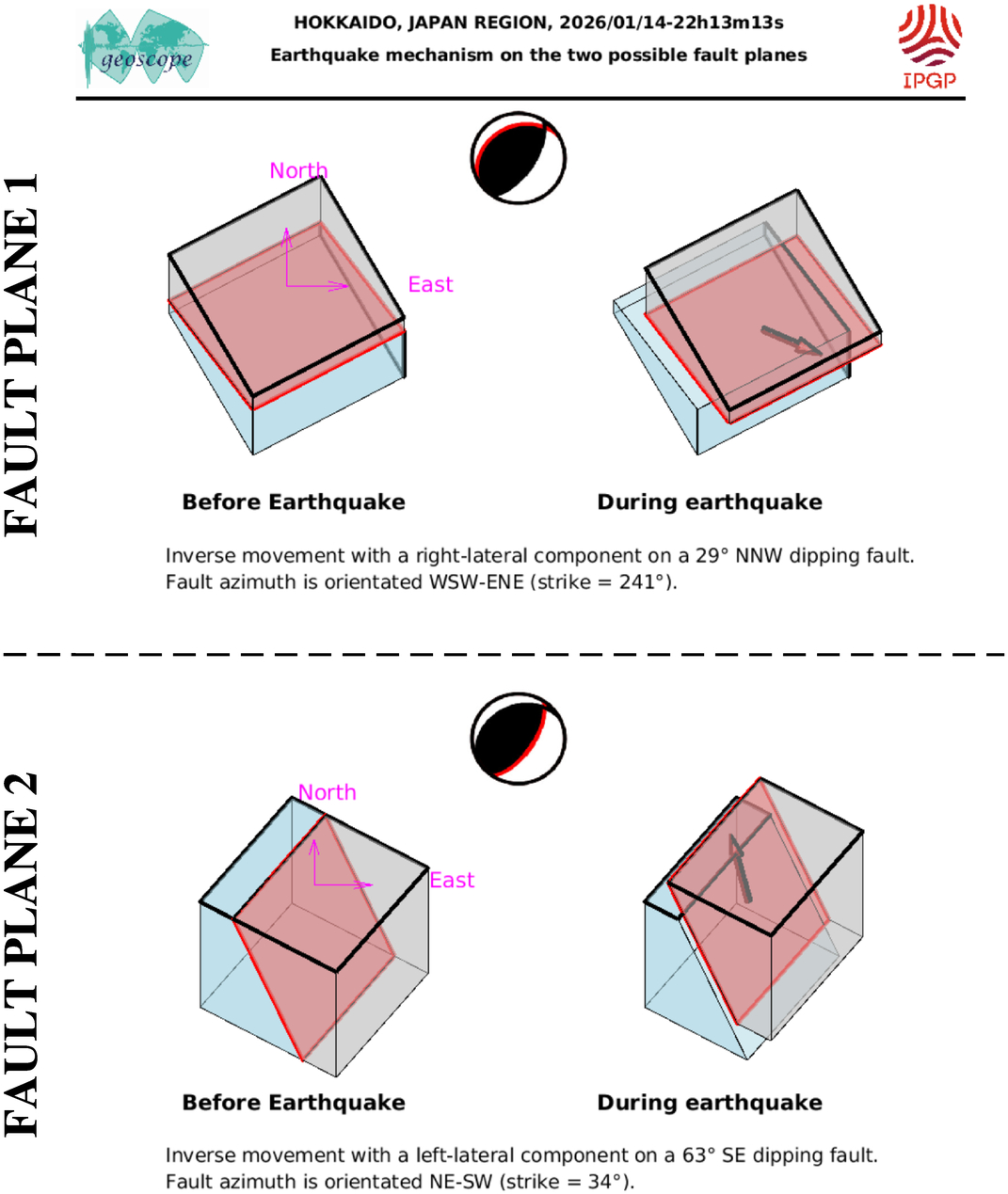 This figure illustrates how the two blocks separated by the seismic fault are displaced during the earthquake. These movements are deduced from the SCARDEC focal mechanism, on the two possible fault planes. Additional information (tectonics, near-fault measurements) is required to determine which one of these two hypotheses corresponds to the real movements during the earthquake.