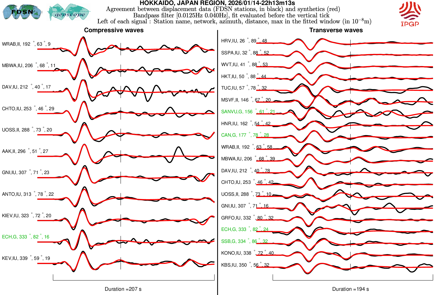 The SCARDEC solution is used here to predict the waveforms at all Geoscope stations received in real time and located at distances between 30° and 150° from the earthquake. All available location codes are used, for the BH* channels. In the range [30° - ~90°], the prediction is done on P and S(H) waves and in the range [~90° - 150°], it is done on PP and SS(H) waves. See agreement for P or PP waves (vertical components) between data and synthetics in Figure 1; see agreement for S(H) or SS(H) waves (horizontal components) between data (black) and synthetics (red) in Figure 2. Tables 1 and 2 provide quantitative estimates of these agreements.