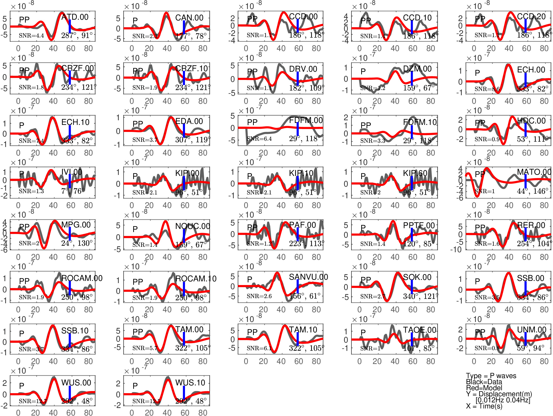 Figure 1: Agreement between data (black) and synthetics (red) for P or PP waves (the type of waves used is indicated in each subfigure). The comparison is shown with a time shift (noted 'Dt1' in Table 1), corresponding to the optimal fit ('Fit1' in Table 1) before the blue tick. Also indicated are the azimuth and distance of the station, and the signal to noise ratio (SNR). Note that the prediction done for PP waves is expected to be less accurate than the one for P waves.