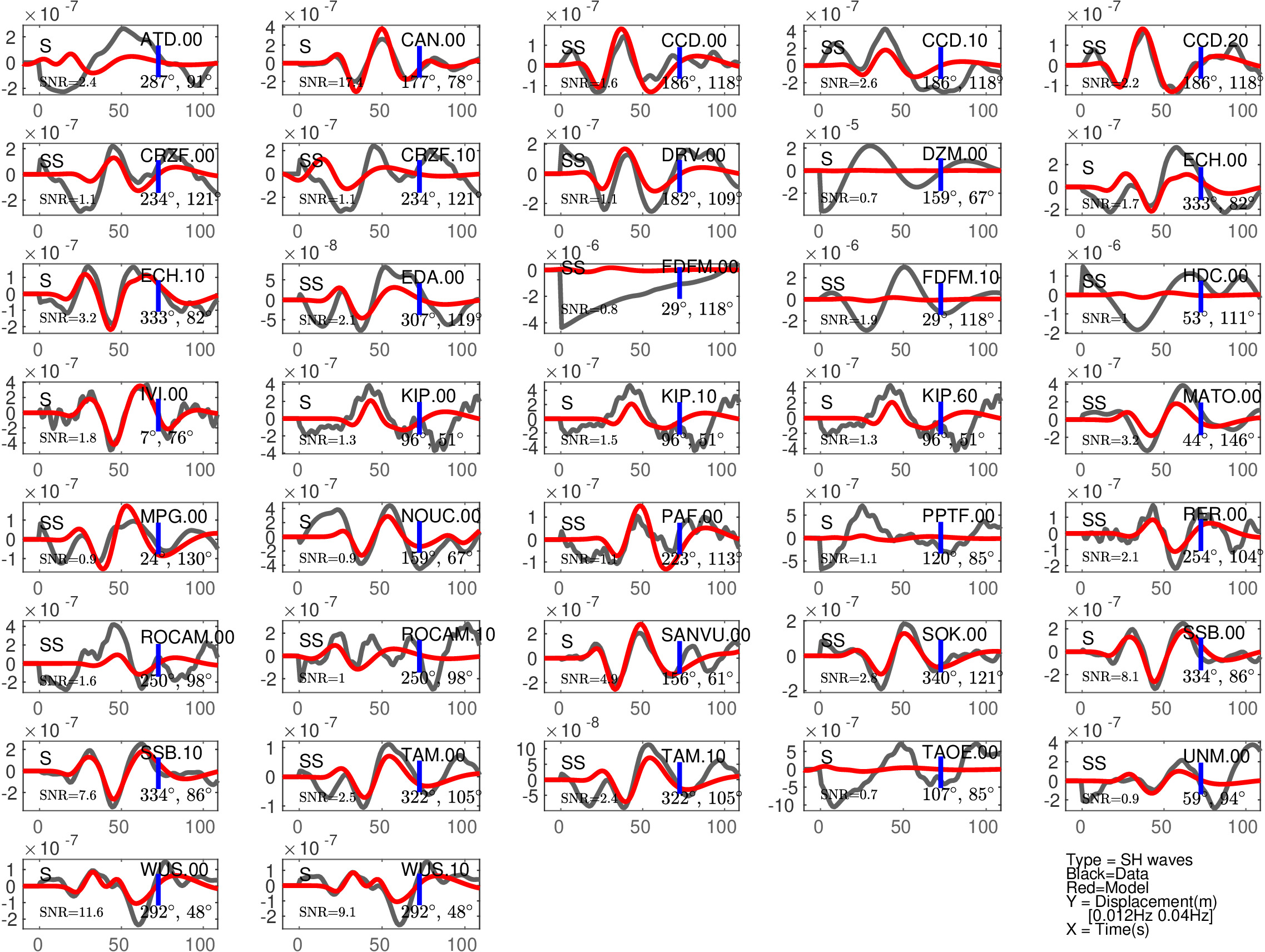 Figure 2: Same as Figure 1, but for S(H) or SS(H) waves (use of the rotated horizontal component along the transverse direction). See in Table 2 the quantitative estimates ('Dt1' and 'Fit1') corresponding to this Figure.