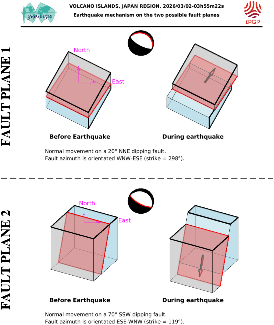 This figure illustrates how the two blocks separated by the seismic fault are displaced during the earthquake. These movements are deduced from the SCARDEC focal mechanism, on the two possible fault planes. Additional information (tectonics, near-fault measurements) is required to determine which one of these two hypotheses corresponds to the real movements during the earthquake.
