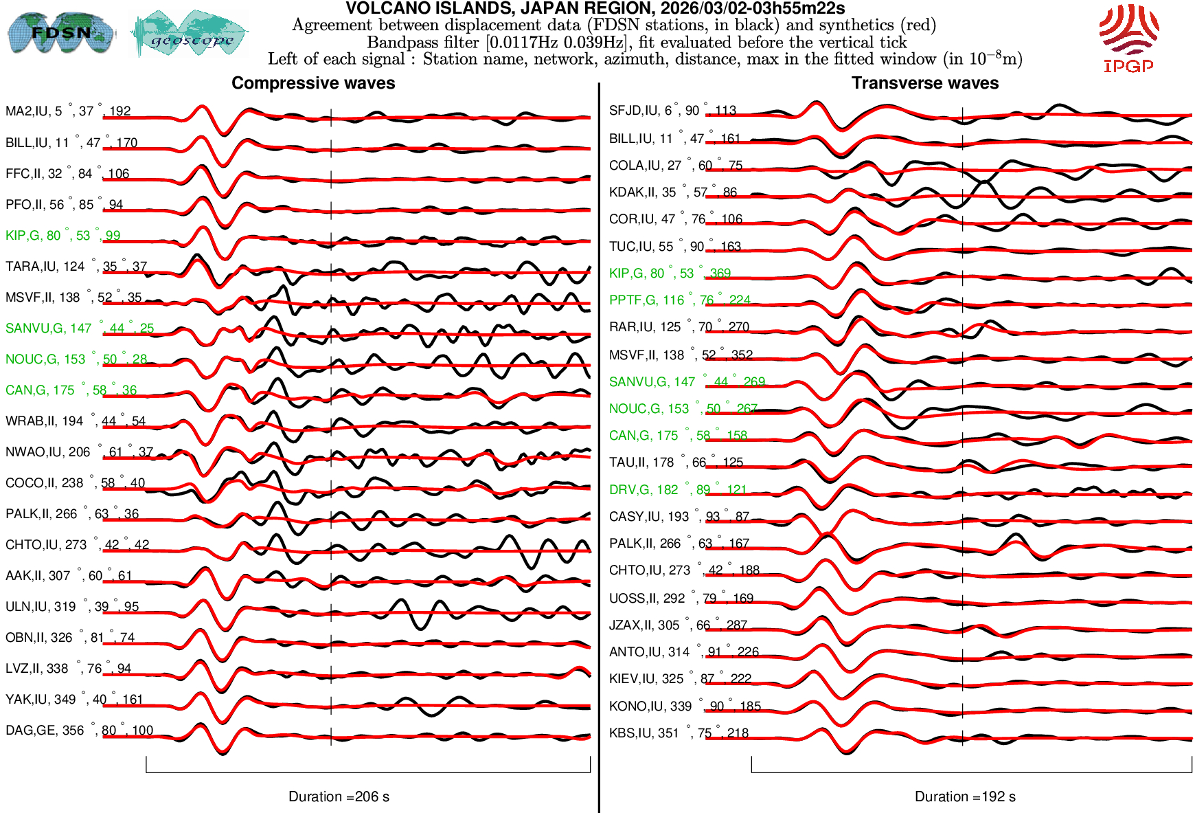 The SCARDEC solution is used here to predict the waveforms at all Geoscope stations received in real time and located at distances between 30° and 150° from the earthquake. All available location codes are used, for the BH* channels. In the range [30° - ~90°], the prediction is done on P and S(H) waves and in the range [~90° - 150°], it is done on PP and SS(H) waves. See agreement for P or PP waves (vertical components) between data and synthetics in Figure 1; see agreement for S(H) or SS(H) waves (horizontal components) between data (black) and synthetics (red) in Figure 2. Tables 1 and 2 provide quantitative estimates of these agreements.