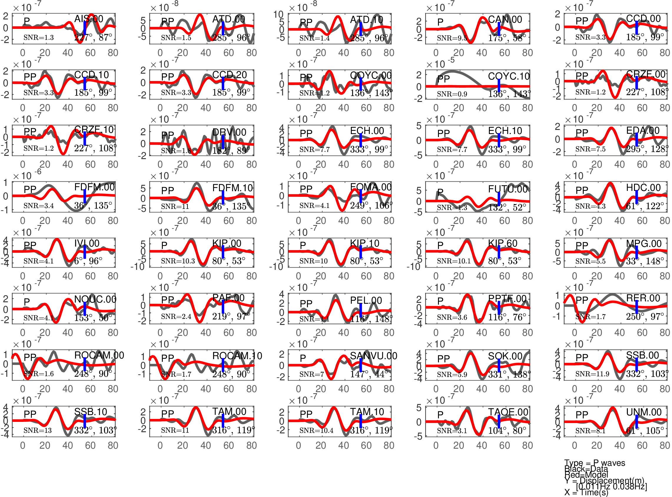 Figure 1: Agreement between data (black) and synthetics (red) for P or PP waves (the type of waves used is indicated in each subfigure). The comparison is shown with a time shift (noted 'Dt1' in Table 1), corresponding to the optimal fit ('Fit1' in Table 1) before the blue tick. Also indicated are the azimuth and distance of the station, and the signal to noise ratio (SNR). Note that the prediction done for PP waves is expected to be less accurate than the one for P waves.