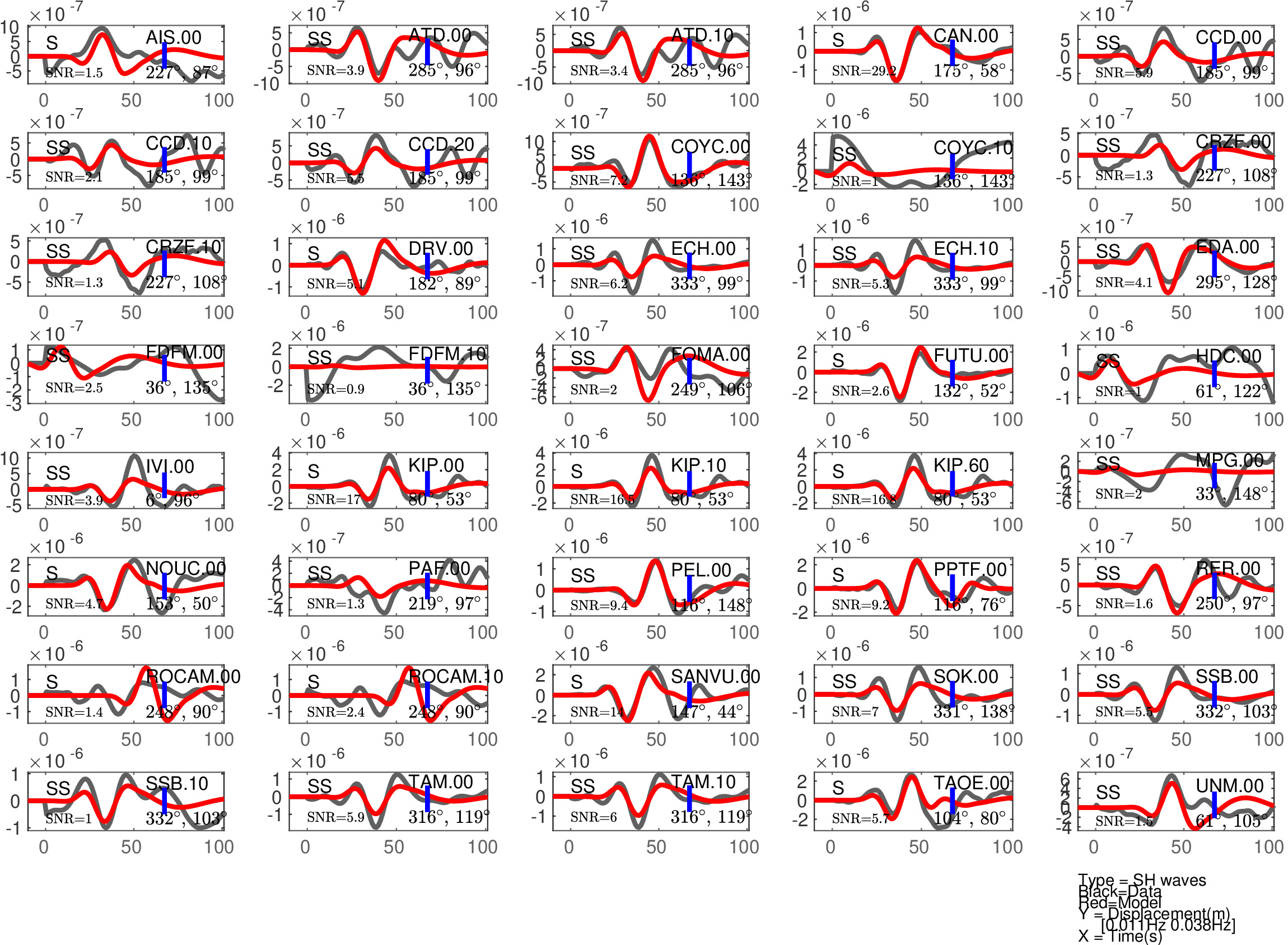Figure 2: Same as Figure 1, but for S(H) or SS(H) waves (use of the rotated horizontal component along the transverse direction). See in Table 2 the quantitative estimates ('Dt1' and 'Fit1') corresponding to this Figure.