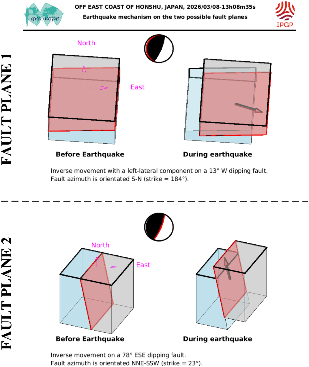 This figure illustrates how the two blocks separated by the seismic fault are displaced during the earthquake. These movements are deduced from the SCARDEC focal mechanism, on the two possible fault planes. Additional information (tectonics, near-fault measurements) is required to determine which one of these two hypotheses corresponds to the real movements during the earthquake.