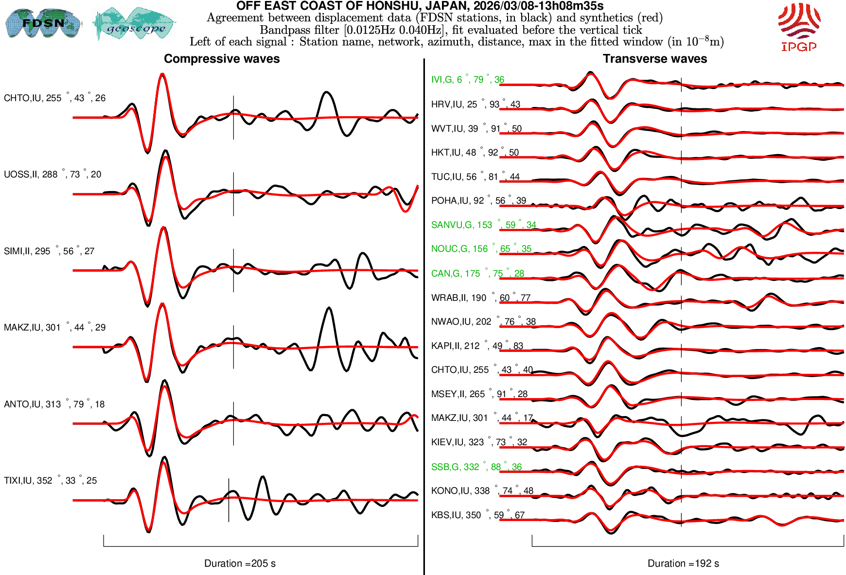 The SCARDEC solution is used here to predict the waveforms at all Geoscope stations received in real time and located at distances between 30° and 150° from the earthquake. All available location codes are used, for the BH* channels. In the range [30° - ~90°], the prediction is done on P and S(H) waves and in the range [~90° - 150°], it is done on PP and SS(H) waves. See agreement for P or PP waves (vertical components) between data and synthetics in Figure 1; see agreement for S(H) or SS(H) waves (horizontal components) between data (black) and synthetics (red) in Figure 2. Tables 1 and 2 provide quantitative estimates of these agreements.