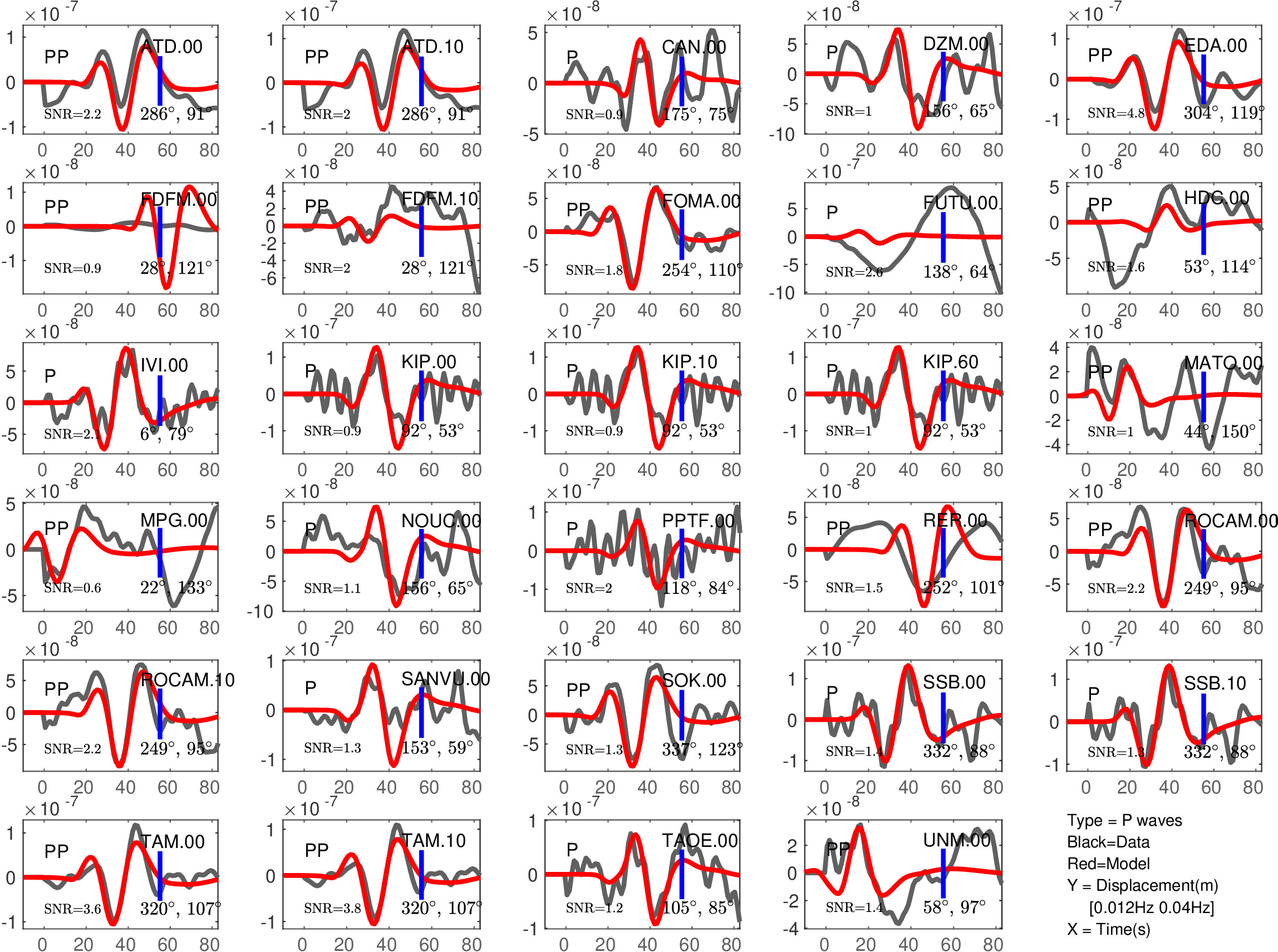 Figure 1: Agreement between data (black) and synthetics (red) for P or PP waves (the type of waves used is indicated in each subfigure). The comparison is shown with a time shift (noted 'Dt1' in Table 1), corresponding to the optimal fit ('Fit1' in Table 1) before the blue tick. Also indicated are the azimuth and distance of the station, and the signal to noise ratio (SNR). Note that the prediction done for PP waves is expected to be less accurate than the one for P waves.
