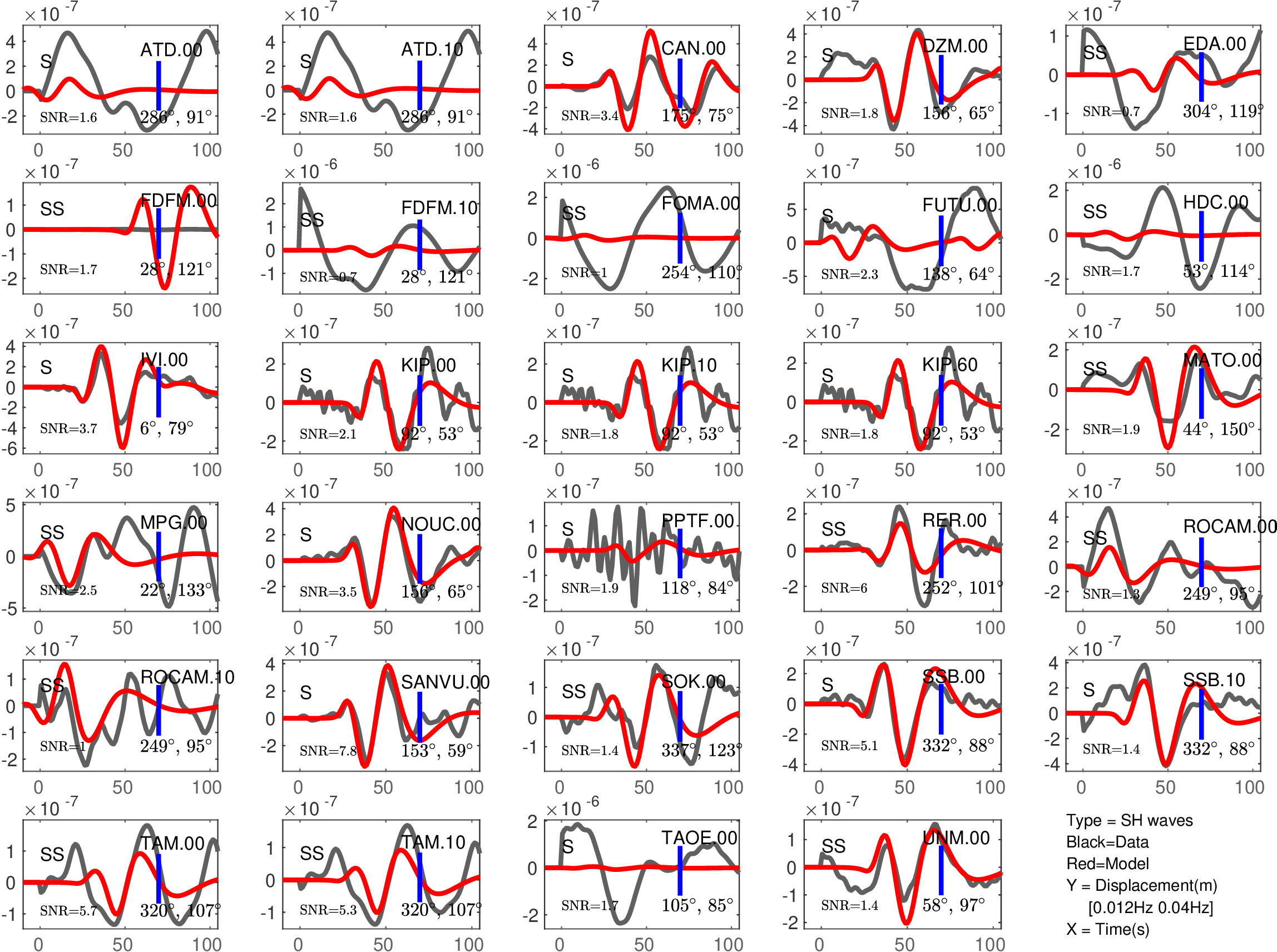 Figure 2: Same as Figure 1, but for S(H) or SS(H) waves (use of the rotated horizontal component along the transverse direction). See in Table 2 the quantitative estimates ('Dt1' and 'Fit1') corresponding to this Figure.