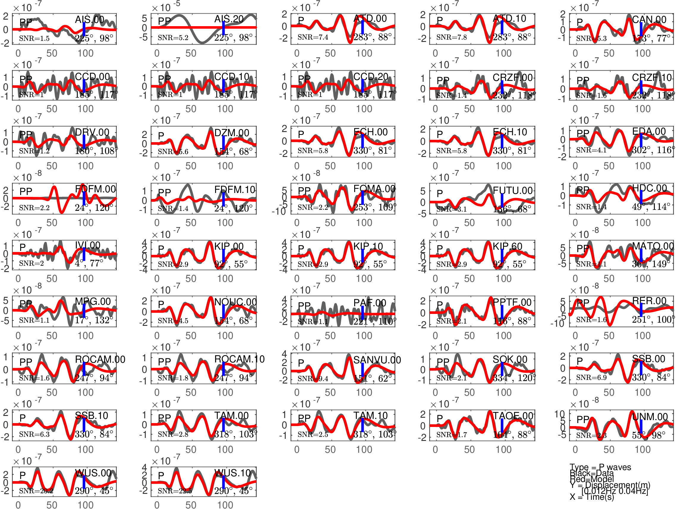Figure 1: Agreement between data (black) and synthetics (red) for P or PP waves (the type of waves used is indicated in each subfigure). The comparison is shown with a time shift (noted 'Dt1' in Table 1), corresponding to the optimal fit ('Fit1' in Table 1) before the blue tick. Also indicated are the azimuth and distance of the station, and the signal to noise ratio (SNR). Note that the prediction done for PP waves is expected to be less accurate than the one for P waves.