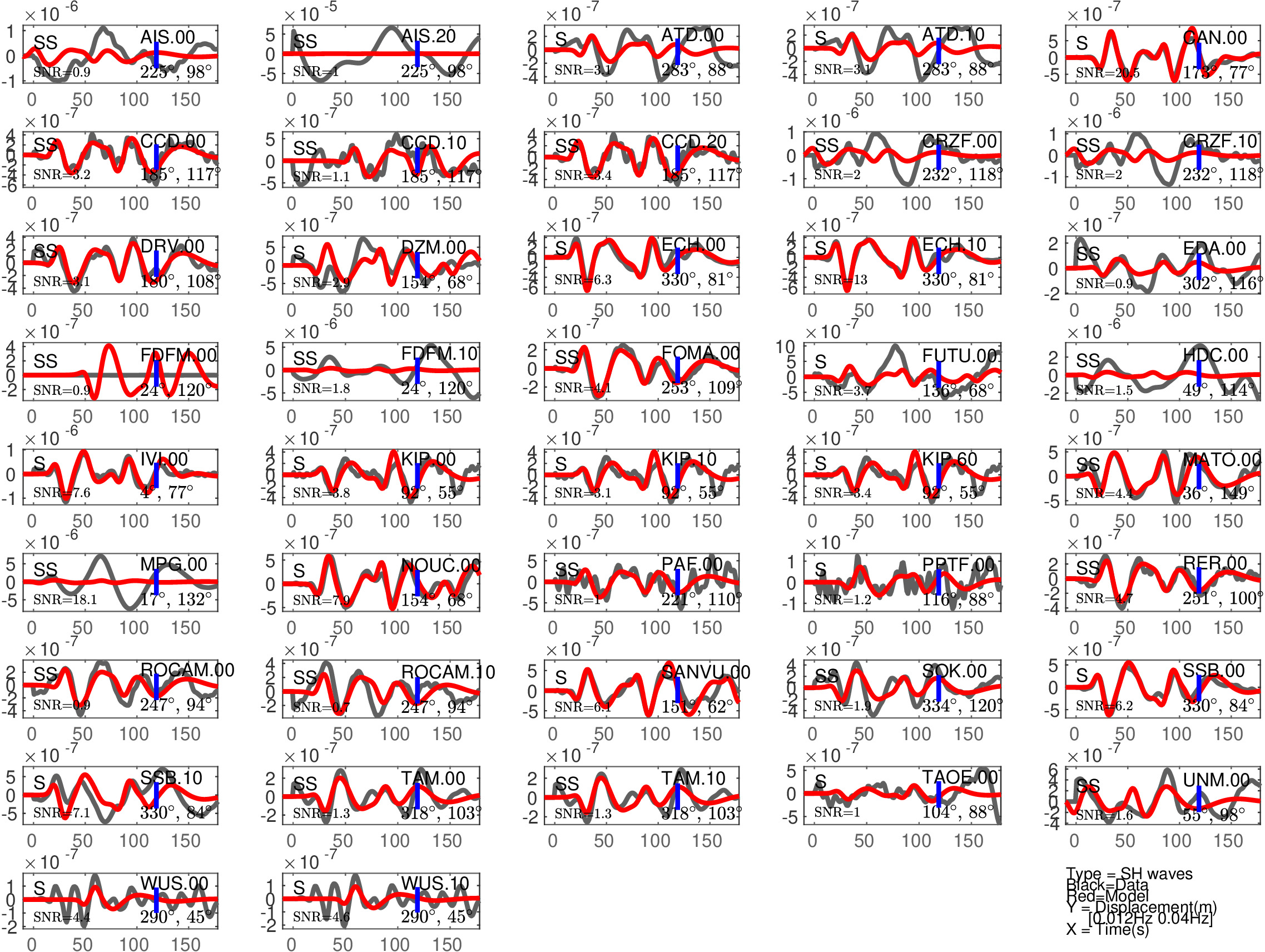 The SCARDEC solution is used here to predict the waveforms at all Geoscope stations received in real time and located at distances between 30° and 150° from the earthquake. All available location codes are used, for the BH* channels. In the range [30° - ~90°], the prediction is done on P and S(H) waves and in the range [~90° - 150°], it is done on PP and SS(H) waves. See agreement for P or PP waves (vertical components) between data and synthetics in Figure 1; see agreement for S(H) or SS(H) waves (horizontal components) between data (black) and synthetics (red) in Figure 2. Tables 1 and 2 provide quantitative estimates of these agreements.