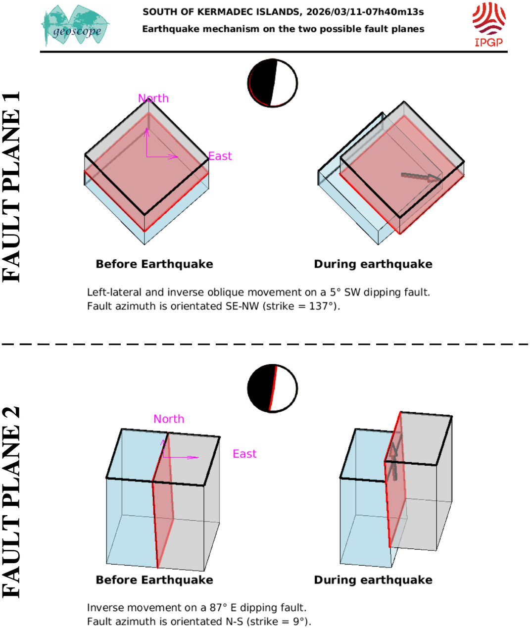 This figure illustrates how the two blocks separated by the seismic fault are displaced during the earthquake. These movements are deduced from the SCARDEC focal mechanism, on the two possible fault planes. Additional information (tectonics, near-fault measurements) is required to determine which one of these two hypotheses corresponds to the real movements during the earthquake.