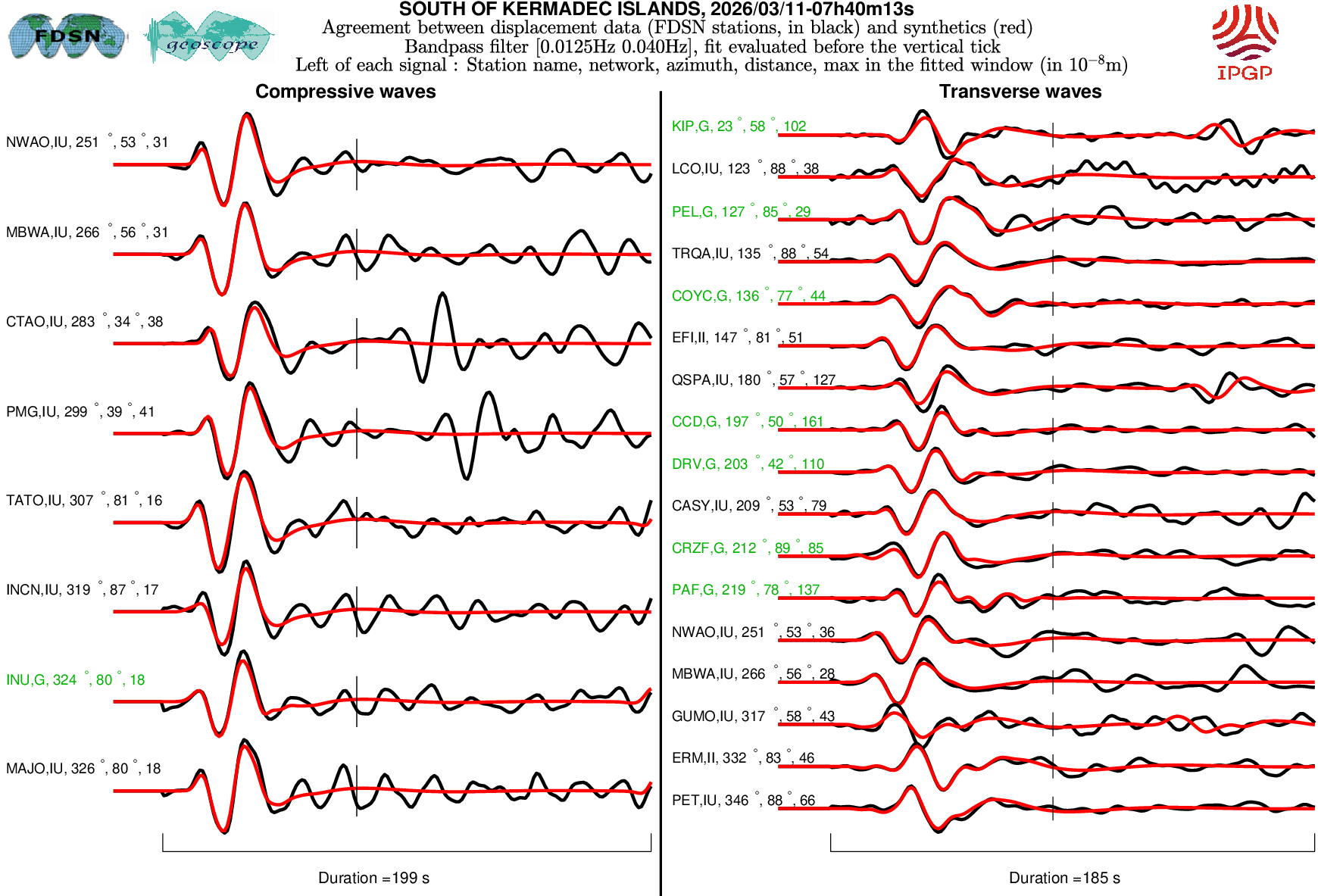 The SCARDEC solution is used here to predict the waveforms at all Geoscope stations received in real time and located at distances between 30° and 150° from the earthquake. All available location codes are used, for the BH* channels. In the range [30° - ~90°], the prediction is done on P and S(H) waves and in the range [~90° - 150°], it is done on PP and SS(H) waves. See agreement for P or PP waves (vertical components) between data and synthetics in Figure 1; see agreement for S(H) or SS(H) waves (horizontal components) between data (black) and synthetics (red) in Figure 2. Tables 1 and 2 provide quantitative estimates of these agreements.