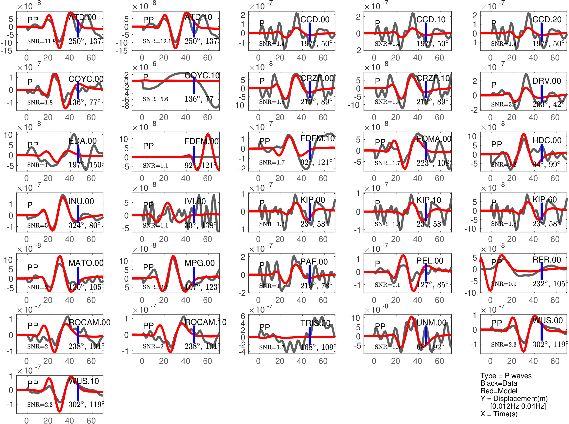 Figure 1: Agreement between data (black) and synthetics (red) for P or PP waves (the type of waves used is indicated in each subfigure). The comparison is shown with a time shift (noted 'Dt1' in Table 1), corresponding to the optimal fit ('Fit1' in Table 1) before the blue tick. Also indicated are the azimuth and distance of the station, and the signal to noise ratio (SNR). Note that the prediction done for PP waves is expected to be less accurate than the one for P waves.