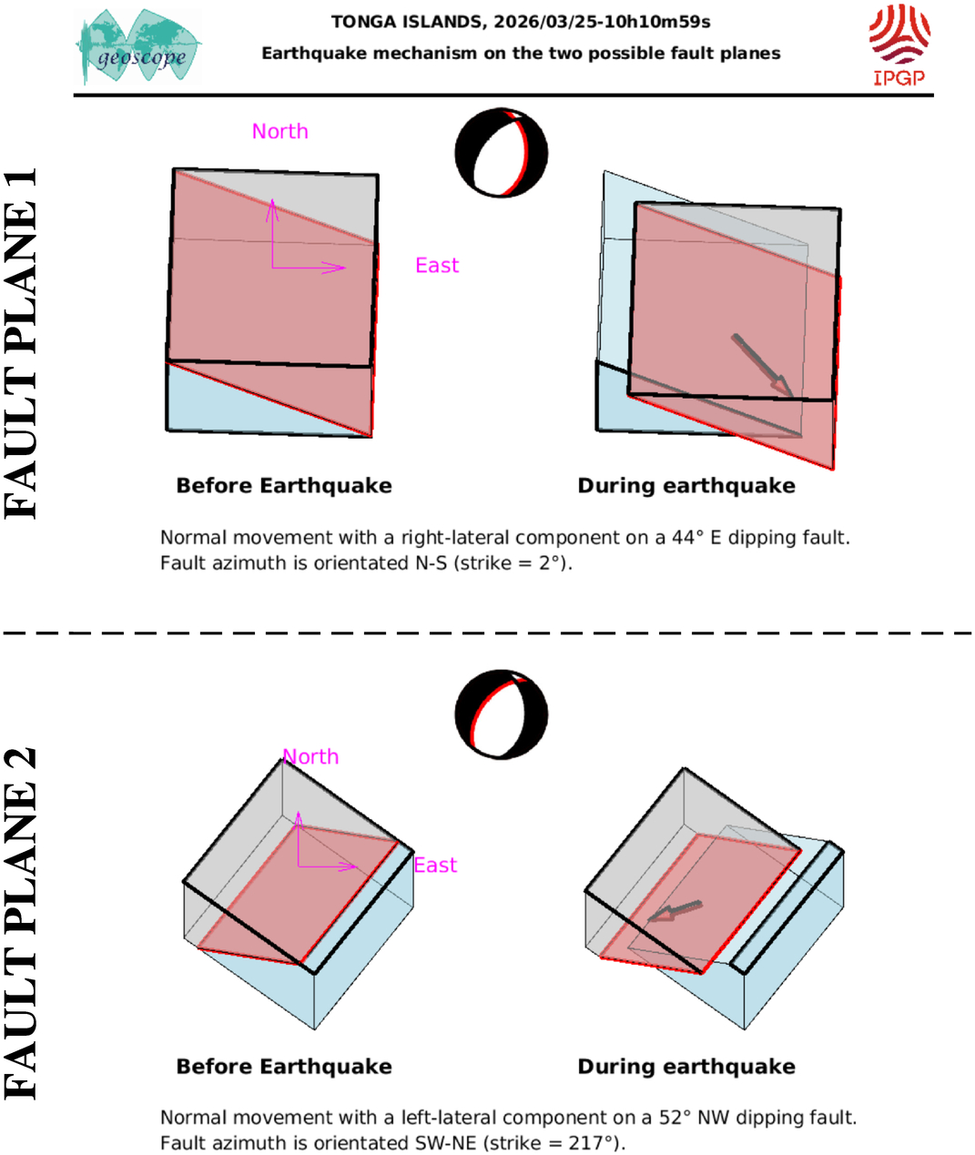 This figure illustrates how the two blocks separated by the seismic fault are displaced during the earthquake. These movements are deduced from the SCARDEC focal mechanism, on the two possible fault planes. Additional information (tectonics, near-fault measurements) is required to determine which one of these two hypotheses corresponds to the real movements during the earthquake.