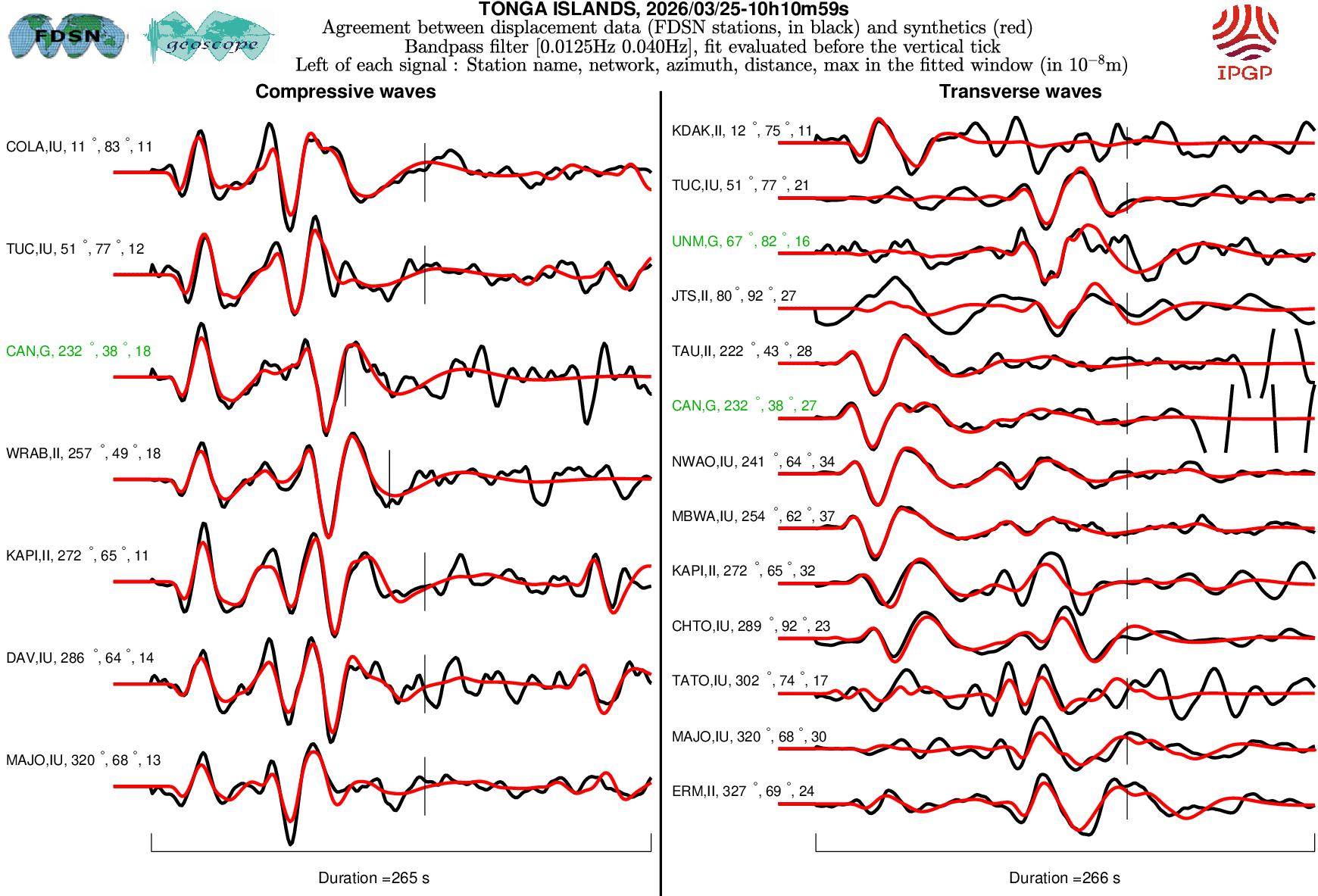 The SCARDEC solution is used here to predict the waveforms at all Geoscope stations received in real time and located at distances between 30° and 150° from the earthquake. All available location codes are used, for the BH* channels. In the range [30° - ~90°], the prediction is done on P and S(H) waves and in the range [~90° - 150°], it is done on PP and SS(H) waves. See agreement for P or PP waves (vertical components) between data and synthetics in Figure 1; see agreement for S(H) or SS(H) waves (horizontal components) between data (black) and synthetics (red) in Figure 2. Tables 1 and 2 provide quantitative estimates of these agreements.