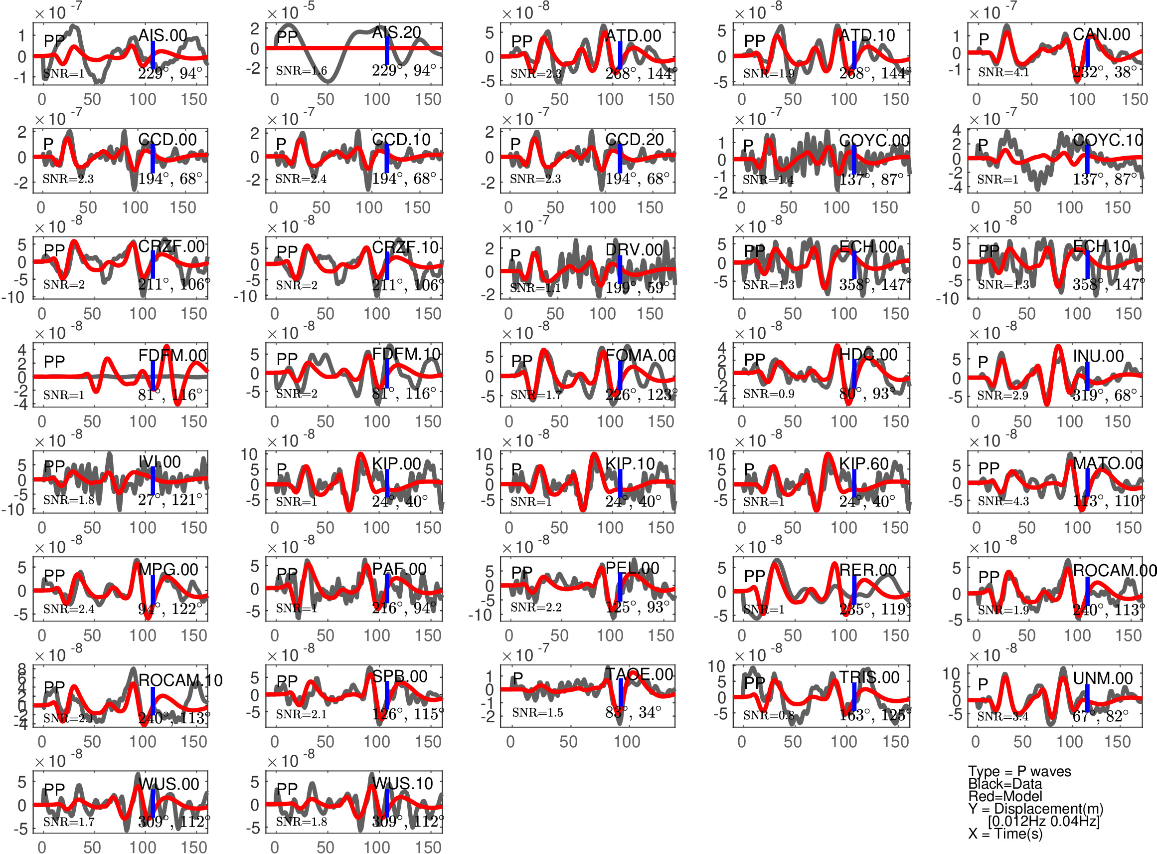 Figure 1: Agreement between data (black) and synthetics (red) for P or PP waves (the type of waves used is indicated in each subfigure). The comparison is shown with a time shift (noted 'Dt1' in Table 1), corresponding to the optimal fit ('Fit1' in Table 1) before the blue tick. Also indicated are the azimuth and distance of the station, and the signal to noise ratio (SNR). Note that the prediction done for PP waves is expected to be less accurate than the one for P waves.