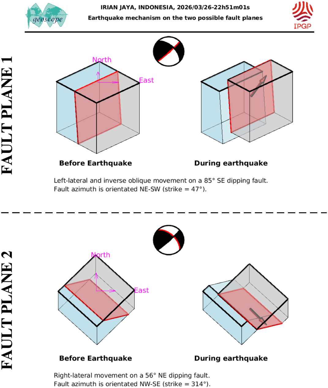 This figure illustrates how the two blocks separated by the seismic fault are displaced during the earthquake. These movements are deduced from the SCARDEC focal mechanism, on the two possible fault planes. Additional information (tectonics, near-fault measurements) is required to determine which one of these two hypotheses corresponds to the real movements during the earthquake.