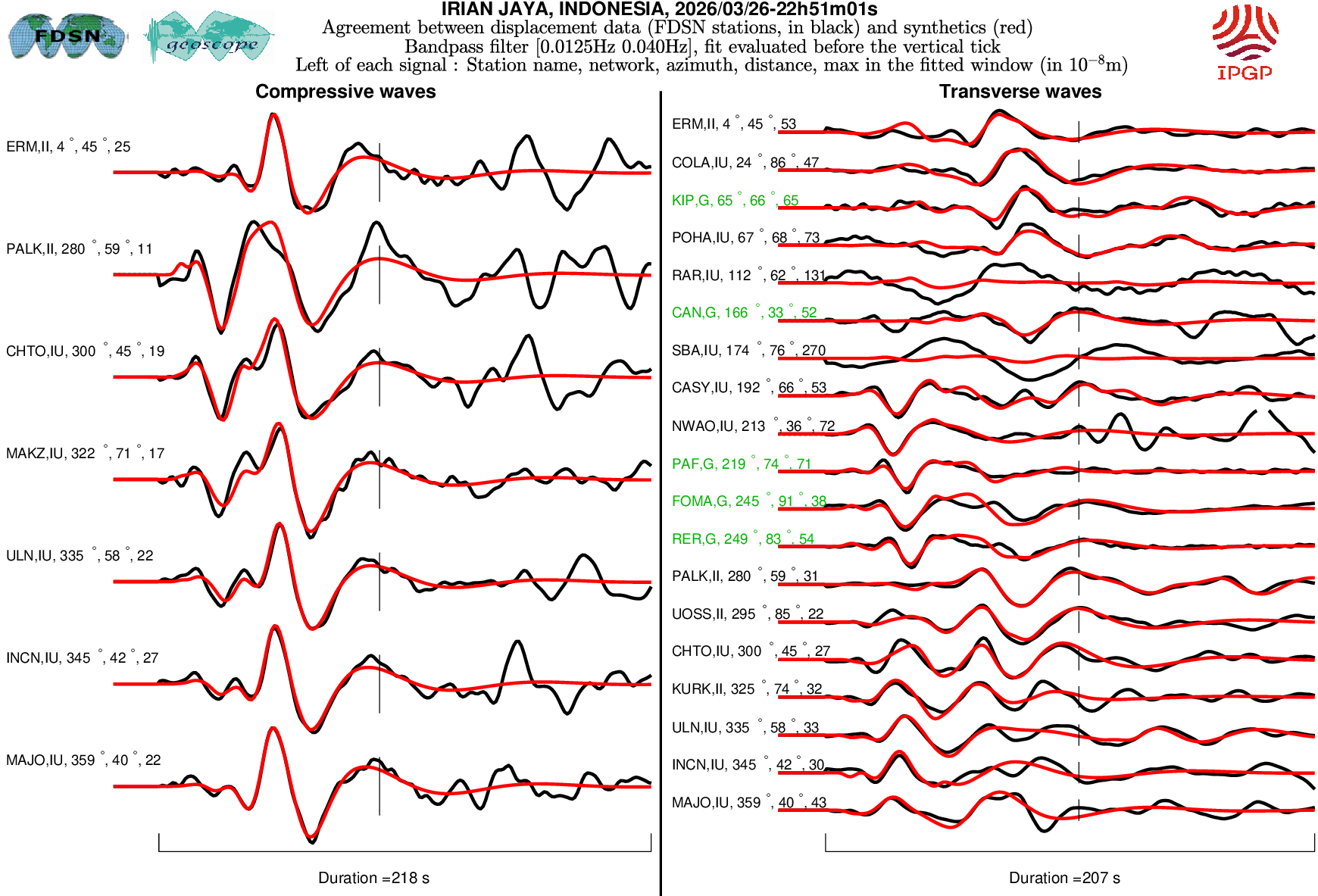 The SCARDEC solution is used here to predict the waveforms at all Geoscope stations received in real time and located at distances between 30° and 150° from the earthquake. All available location codes are used, for the BH* channels. In the range [30° - ~90°], the prediction is done on P and S(H) waves and in the range [~90° - 150°], it is done on PP and SS(H) waves. See agreement for P or PP waves (vertical components) between data and synthetics in Figure 1; see agreement for S(H) or SS(H) waves (horizontal components) between data (black) and synthetics (red) in Figure 2. Tables 1 and 2 provide quantitative estimates of these agreements.