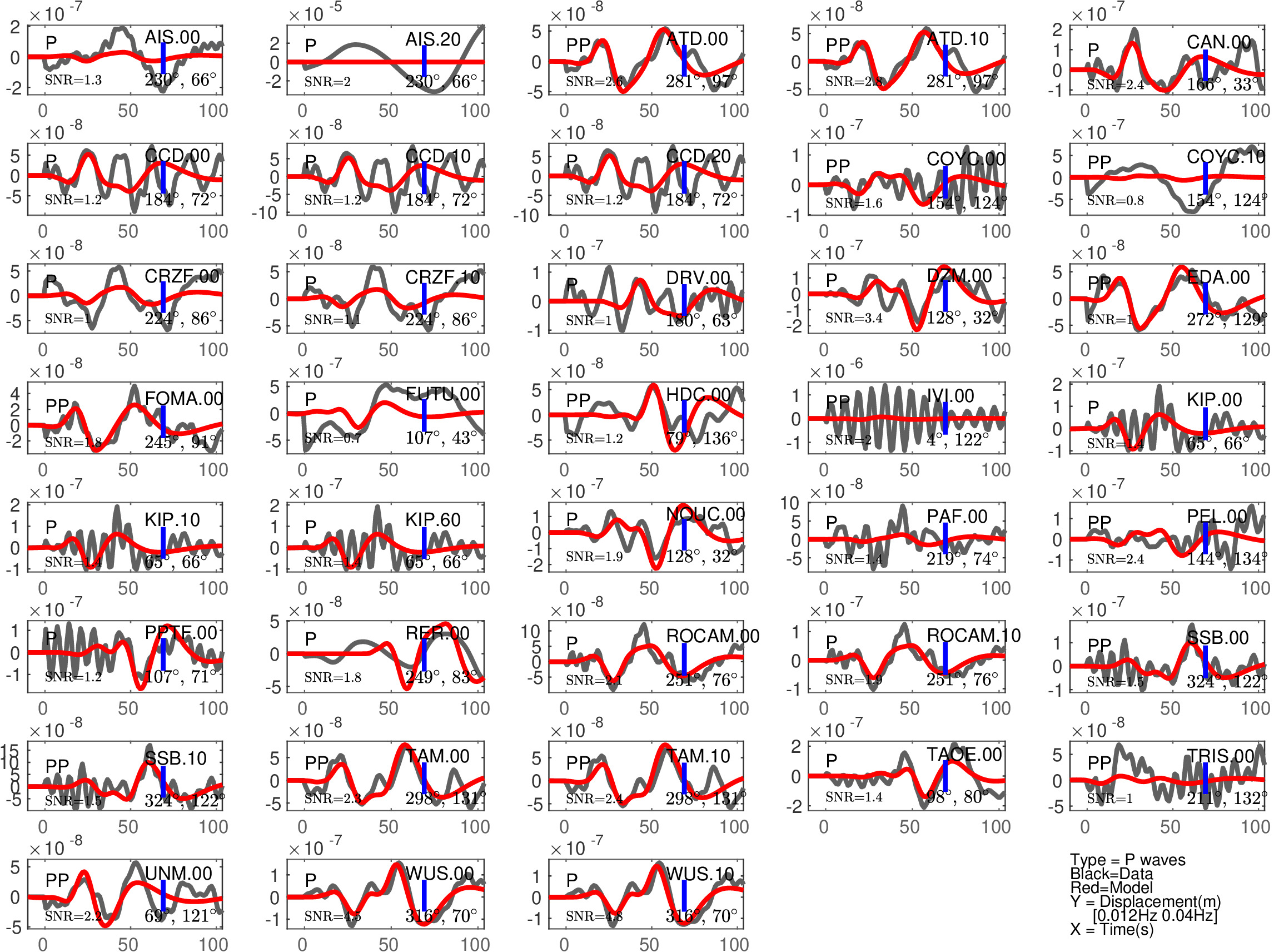 Figure 1: Agreement between data (black) and synthetics (red) for P or PP waves (the type of waves used is indicated in each subfigure). The comparison is shown with a time shift (noted 'Dt1' in Table 1), corresponding to the optimal fit ('Fit1' in Table 1) before the blue tick. Also indicated are the azimuth and distance of the station, and the signal to noise ratio (SNR). Note that the prediction done for PP waves is expected to be less accurate than the one for P waves.