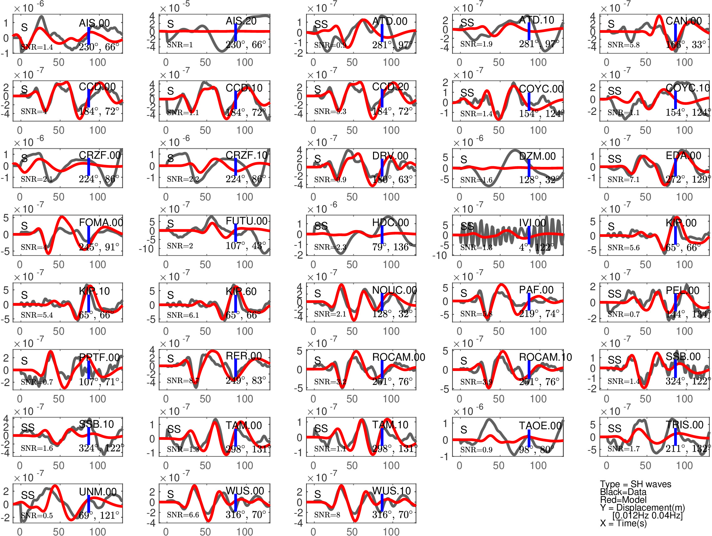 Figure 2: Same as Figure 1, but for S(H) or SS(H) waves (use of the rotated horizontal component along the transverse direction). See in Table 2 the quantitative estimates ('Dt1' and 'Fit1') corresponding to this Figure.