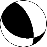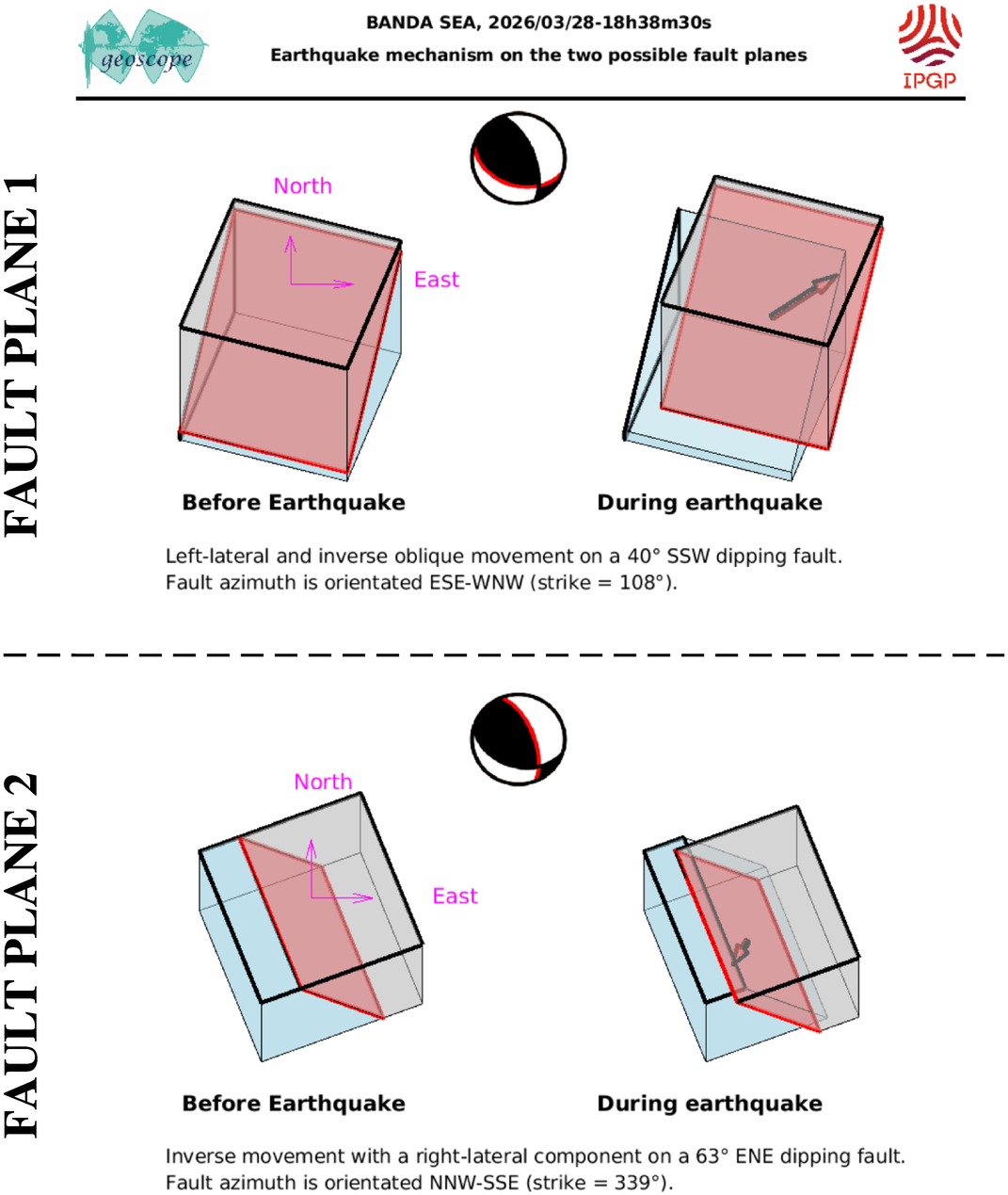 This figure illustrates how the two blocks separated by the seismic fault are displaced during the earthquake. These movements are deduced from the SCARDEC focal mechanism, on the two possible fault planes. Additional information (tectonics, near-fault measurements) is required to determine which one of these two hypotheses corresponds to the real movements during the earthquake.