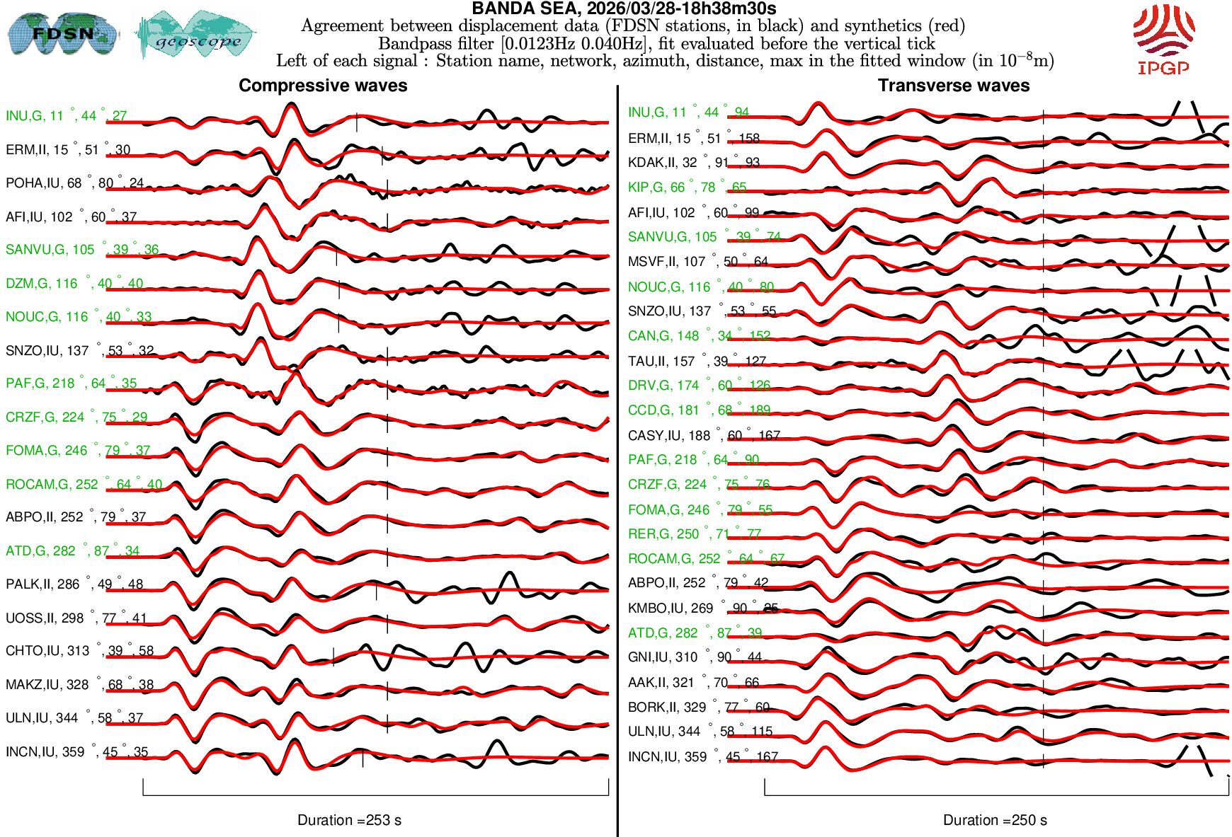 The SCARDEC solution is used here to predict the waveforms at all Geoscope stations received in real time and located at distances between 30° and 150° from the earthquake. All available location codes are used, for the BH* channels. In the range [30° - ~90°], the prediction is done on P and S(H) waves and in the range [~90° - 150°], it is done on PP and SS(H) waves. See agreement for P or PP waves (vertical components) between data and synthetics in Figure 1; see agreement for S(H) or SS(H) waves (horizontal components) between data (black) and synthetics (red) in Figure 2. Tables 1 and 2 provide quantitative estimates of these agreements.