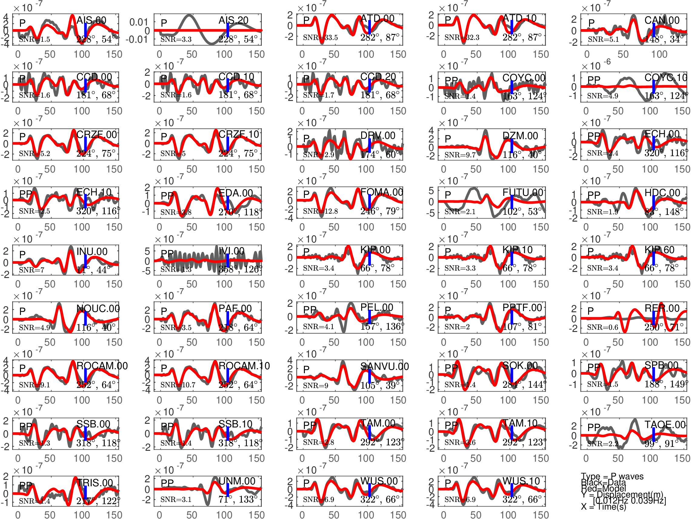 Figure 1: Agreement between data (black) and synthetics (red) for P or PP waves (the type of waves used is indicated in each subfigure). The comparison is shown with a time shift (noted 'Dt1' in Table 1), corresponding to the optimal fit ('Fit1' in Table 1) before the blue tick. Also indicated are the azimuth and distance of the station, and the signal to noise ratio (SNR). Note that the prediction done for PP waves is expected to be less accurate than the one for P waves.