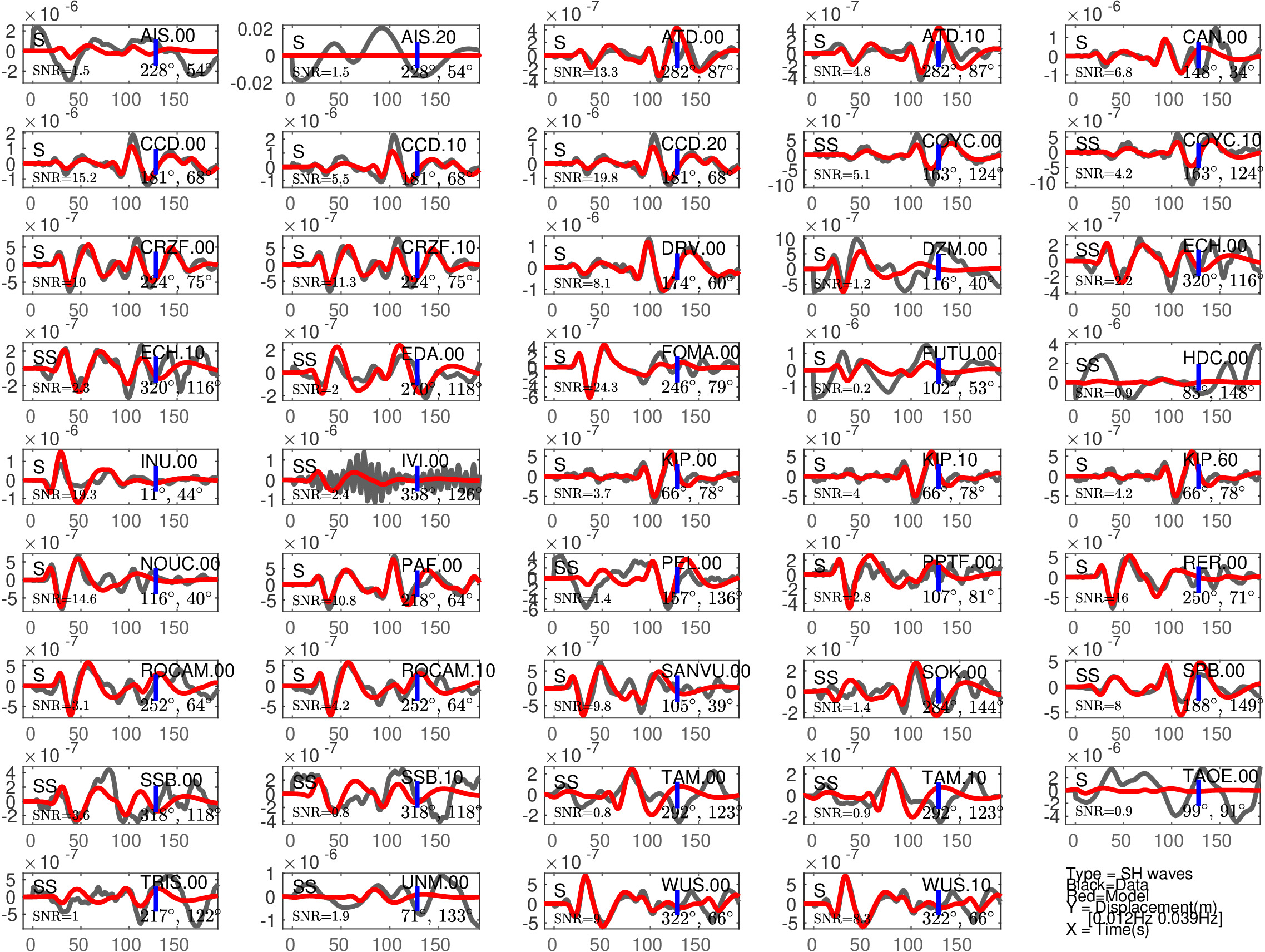 Figure 2: Same as Figure 1, but for S(H) or SS(H) waves (use of the rotated horizontal component along the transverse direction). See in Table 2 the quantitative estimates ('Dt1' and 'Fit1') corresponding to this Figure.
