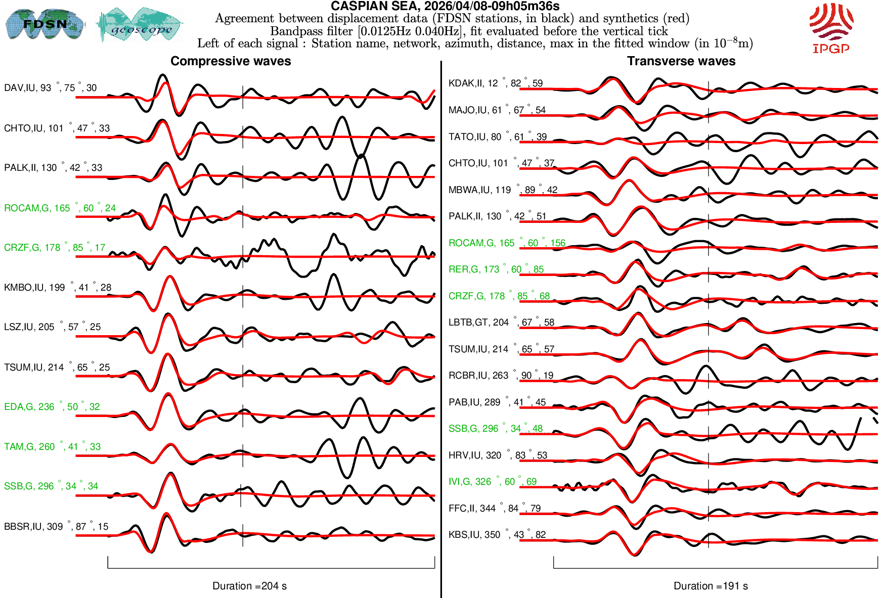 The SCARDEC solution is used here to predict the waveforms at all Geoscope stations received in real time and located at distances between 30° and 150° from the earthquake. All available location codes are used, for the BH* channels. In the range [30° - ~90°], the prediction is done on P and S(H) waves and in the range [~90° - 150°], it is done on PP and SS(H) waves. See agreement for P or PP waves (vertical components) between data and synthetics in Figure 1; see agreement for S(H) or SS(H) waves (horizontal components) between data (black) and synthetics (red) in Figure 2. Tables 1 and 2 provide quantitative estimates of these agreements.