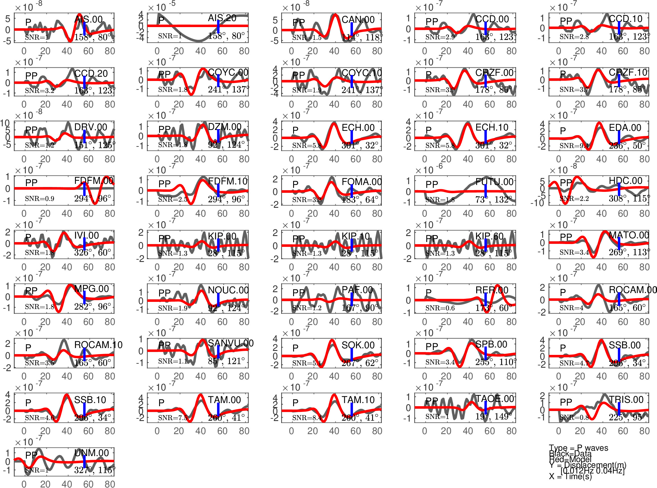 Figure 1: Agreement between data (black) and synthetics (red) for P or PP waves (the type of waves used is indicated in each subfigure). The comparison is shown with a time shift (noted 'Dt1' in Table 1), corresponding to the optimal fit ('Fit1' in Table 1) before the blue tick. Also indicated are the azimuth and distance of the station, and the signal to noise ratio (SNR). Note that the prediction done for PP waves is expected to be less accurate than the one for P waves.