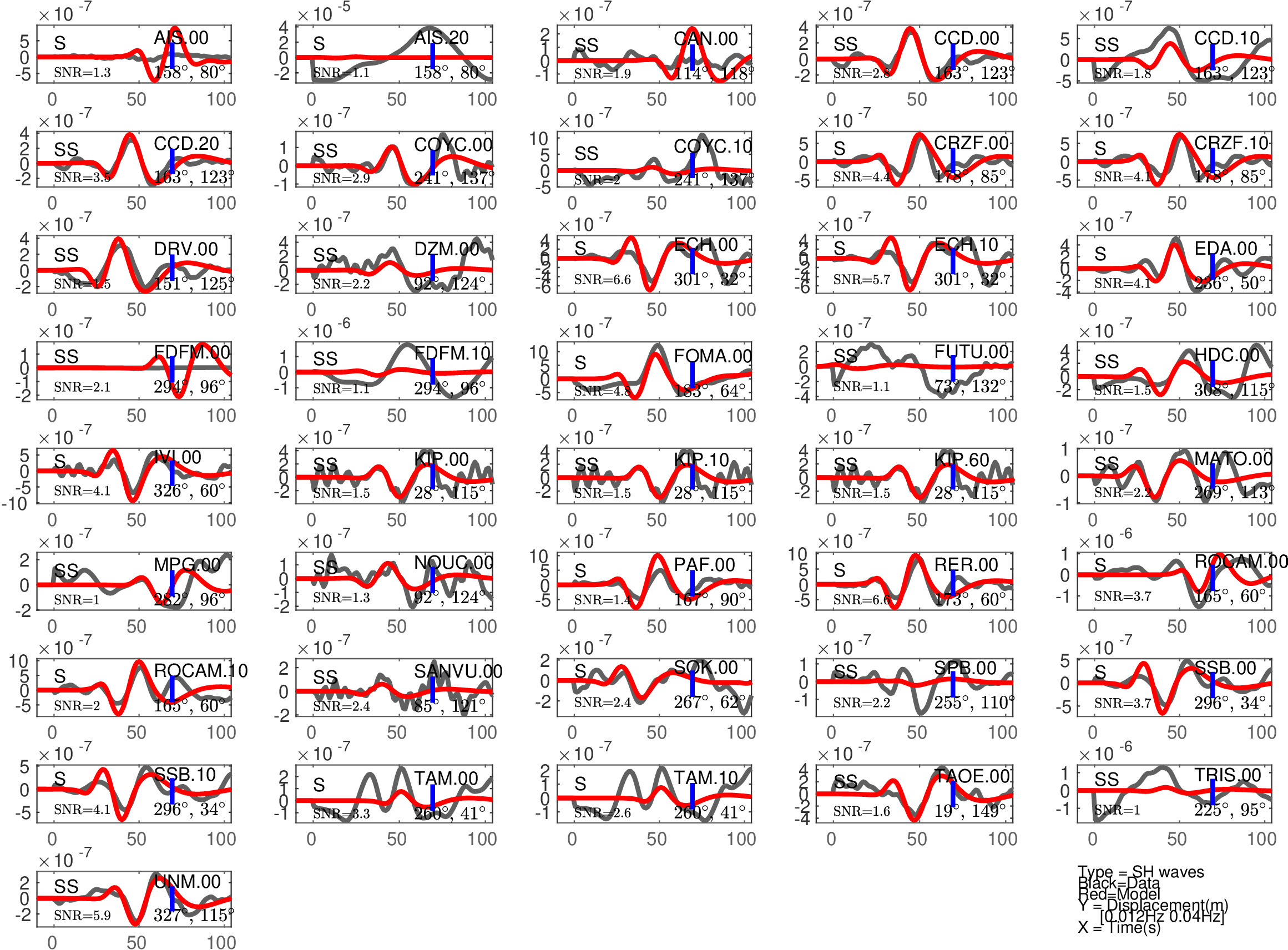 Figure 2: Same as Figure 1, but for S(H) or SS(H) waves (use of the rotated horizontal component along the transverse direction). See in Table 2 the quantitative estimates ('Dt1' and 'Fit1') corresponding to this Figure.