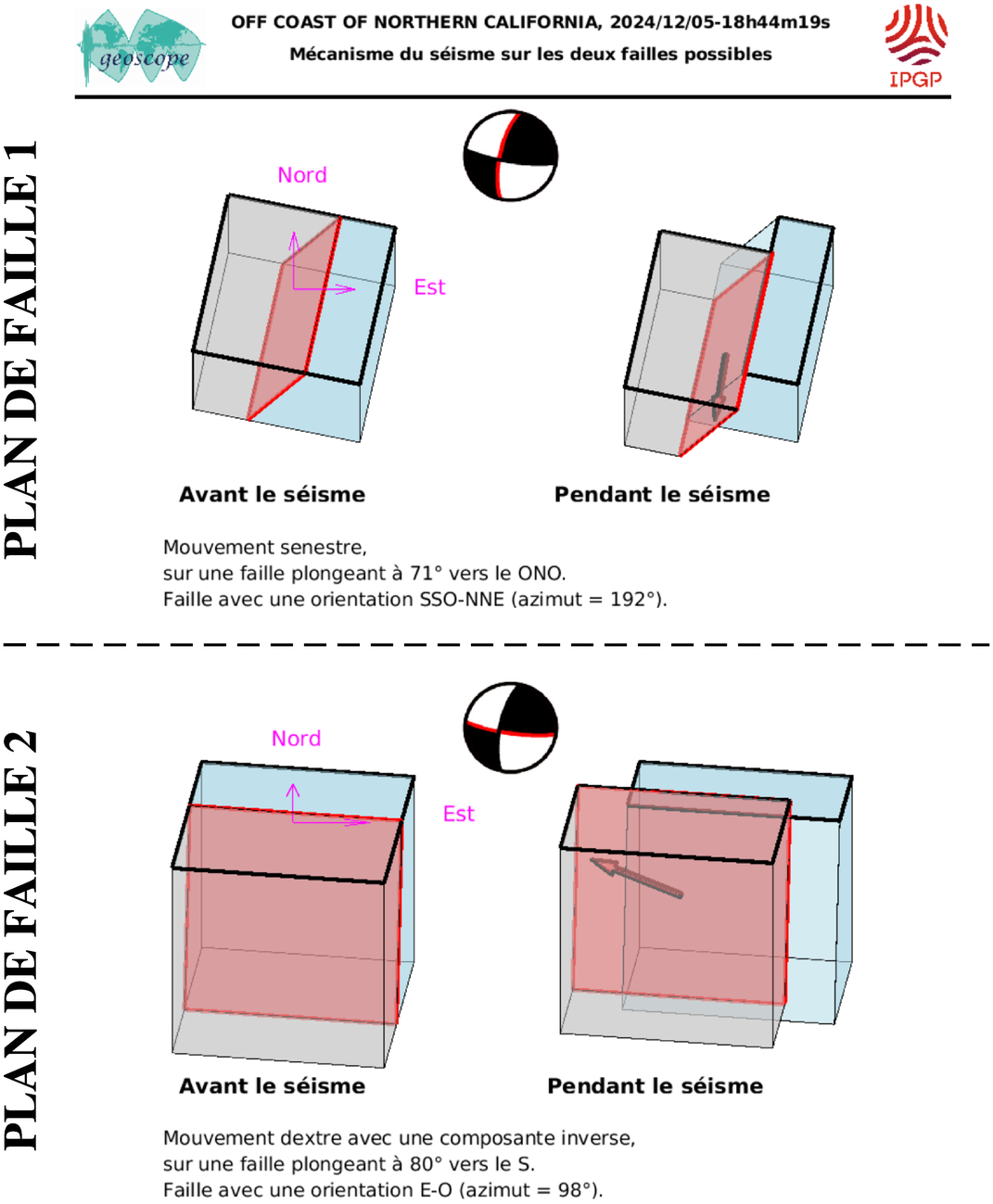 Cette figure illustre comment les deux blocs situés de part et d’autre de la faille sismique sont déplacés durant le séisme. Ces mouvements sont déduits du mécanisme au foyer déterminé par SCARDEC, sur les deux plans de faille possibles. Des informations additionnelles (tectonique, mesures à proximité du séisme) sont nécessaires pour déterminer laquelle de ces deux hypothèses correspond au mouvement réel durant le séisme.