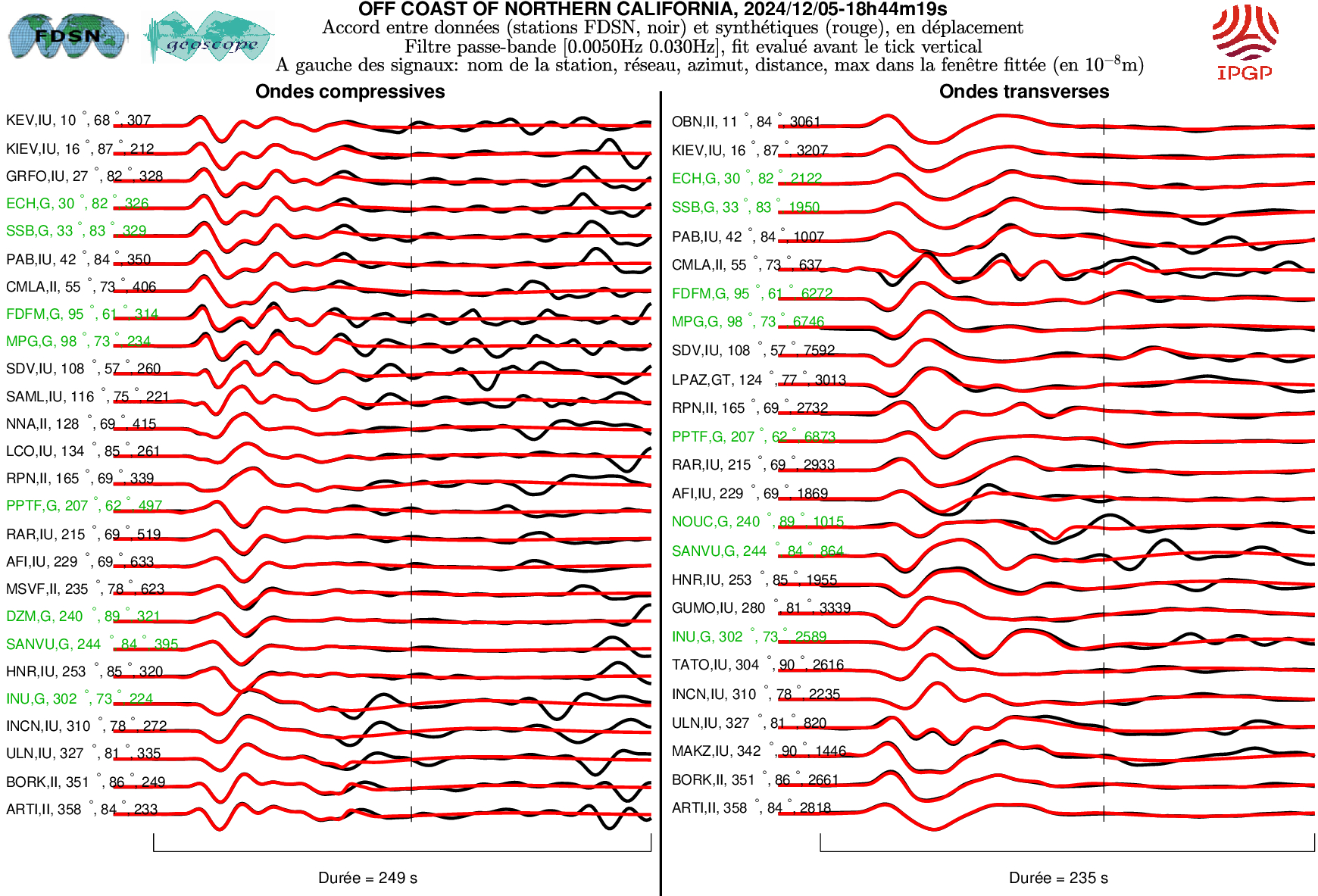 The SCARDEC solution is used here to predict the waveforms at all Geoscope stations received in real time and located at distances between 30° and 150° from the earthquake. All available location codes are used, for the BH* channels. In the range [30° - ~90°], the prediction is done on P and S(H) waves and in the range [~90° - 150°], it is done on PP and SS(H) waves. See agreement for P or PP waves (vertical components) between data and synthetics in Figure 1; see agreement for S(H) or SS(H) waves (horizontal components) between data (black) and synthetics (red) in Figure 2. Tables 1 and 2 provide quantitative estimates of these agreements.