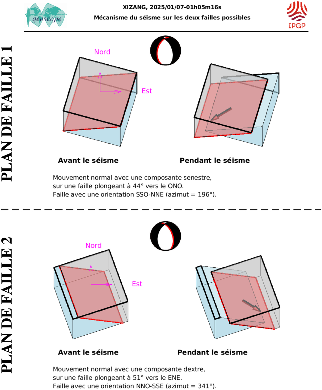 Cette figure illustre comment les deux blocs situés de part et d’autre de la faille sismique sont déplacés durant le séisme. Ces mouvements sont déduits du mécanisme au foyer déterminé par SCARDEC, sur les deux plans de faille possibles. Des informations additionnelles (tectonique, mesures à proximité du séisme) sont nécessaires pour déterminer laquelle de ces deux hypothèses correspond au mouvement réel durant le séisme.