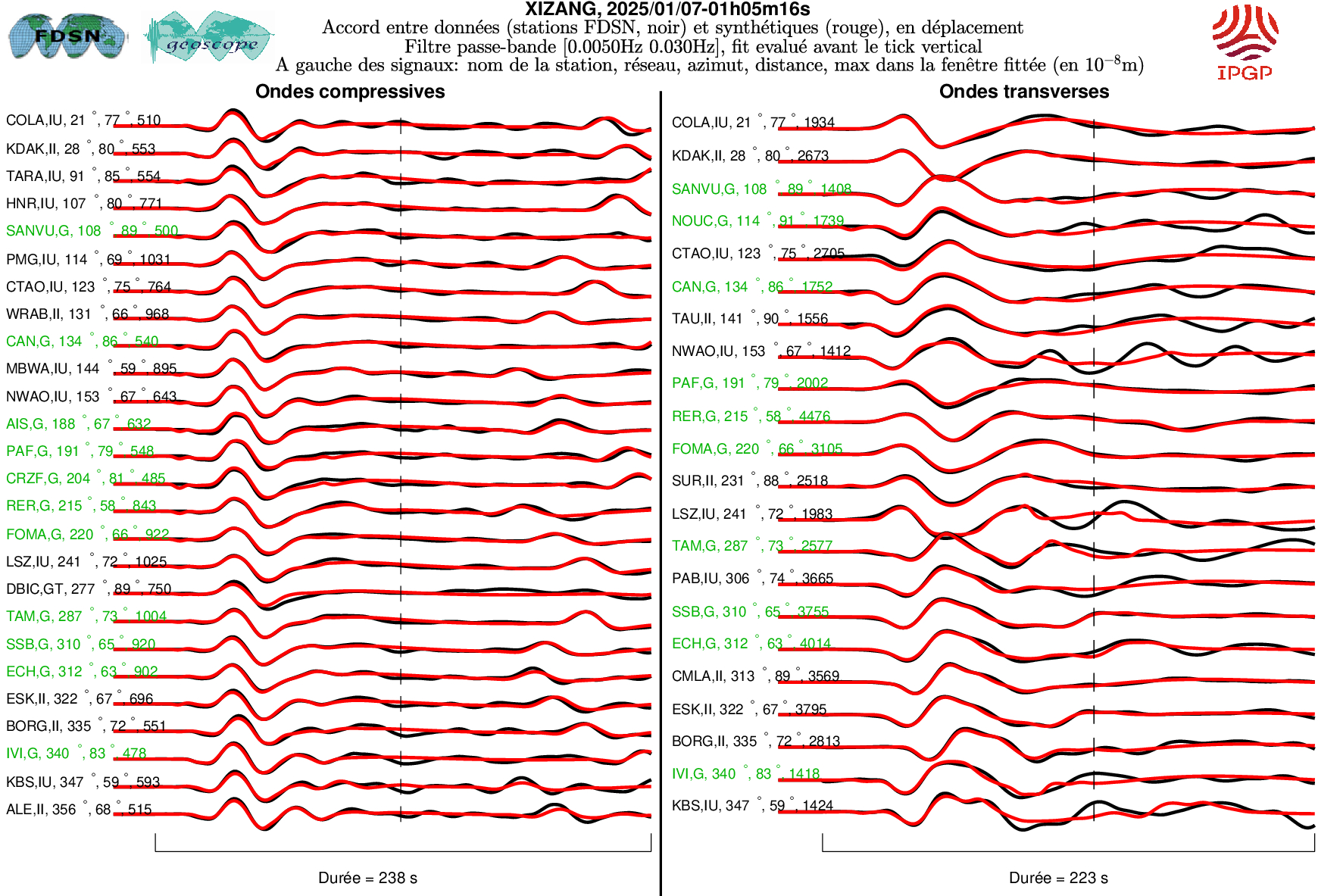 The SCARDEC solution is used here to predict the waveforms at all Geoscope stations received in real time and located at distances between 30° and 150° from the earthquake. All available location codes are used, for the BH* channels. In the range [30° - ~90°], the prediction is done on P and S(H) waves and in the range [~90° - 150°], it is done on PP and SS(H) waves. See agreement for P or PP waves (vertical components) between data and synthetics in Figure 1; see agreement for S(H) or SS(H) waves (horizontal components) between data (black) and synthetics (red) in Figure 2. Tables 1 and 2 provide quantitative estimates of these agreements.